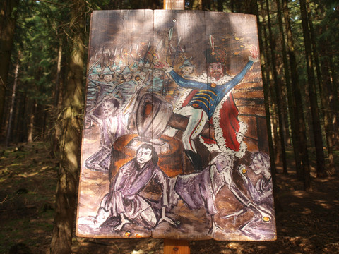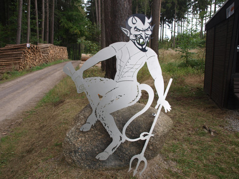 At each location an A4 stainless steel board, attached to a hiking trail post next to the sculpture. Based on the legend of the Hüttematths, a circular route has been created with the following stations, which relate to the places of the legend: - Lange Hütte in the Saigerhütte Olbernhau Grünthal (part of the UNESCO World Heritage) - at the Kupferhammer - entrance to Hüttengrund - in the forest between Hüttengrund and Kalter Kober - Hand crossroads - Tiefer Graben Route: The circular hiking trail marked with a green dot starts at the Lange Hütte in the Saigerhütte area. Passing the Kupferhammer, we follow the marker towards Hüttengrund. The street and the Flöha are crossed. The path leads through Hüttengrund towards Kalter Kober. Along the way, three stations with carvings and pictorial representations are passed. The path then continues uphill to the "Hand" crossroads, where another object is installed. After about 50 meters on the way back, you turn left onto the Dürrer Holzweg. There, two exhibition pieces by Manuela Stock on the topic of Hüttematths are passed. From the Dürrer Holzweg, turn right towards Tiefer Graben. The path leads downhill until you reach the KAMMweg in Tiefer Graben. Follow this to the right towards Kirchweg/forest edge. There you have a very nice view of Olbernhau. Two more glass objects have been passed up to that point. We follow the KAMMweg and the green dot marking back into the Saigerhütte area. Before that, the Oberneuschönberger Church is passed. There, the carver Hans Lichtenberger contributed a dog with a doghouse for the legend trail. Marking: green dot Stations: - Lange Hütte: metal dog (Smith towns) - Hüttengrund / Preißlerberg: sculpture with hammer and owl including signpost (Markus Baumgart) - Hüttengrund: floor print painting "Zarenritt" (Hannes Schaller / Sven Körner) - Kalter Kober: tavern bench with hut inn (Markus Baumgart) - Hand crossroads: devil waits for Matthes (Laser-Tech Olbernhau GmbH) - Dürrer Holzweg: concrete stele Pact written in "blood" (Manuela Stock) - Dürrer Holzweg turnoff Tiefer Graben: sculpture "The unhappy Matthes" (Manuela Stock) - Tiefer Graben – turnoff KAMMweg: glass painting Natzschung valley and house in the forest (Ms. Meinke) - KAMMweg between Kirchweg and Tiefer Graben: forest woman "The Old" (Markus Baumgart) - Kirchweg forest edge: fight of the old woman with the devil (Ms. Meinke) - Oberneuschönberger Church: sculpture dog with doghouse (Hans Lichtenberger) Path condition: well-developed hiking trail, partly asphalted Attractions along the way: Saigerhütte area with Kupferhammer Hand crossroads Gastronomy along the way: Hotel Saigerhütte Olbernhau Bowling Alley